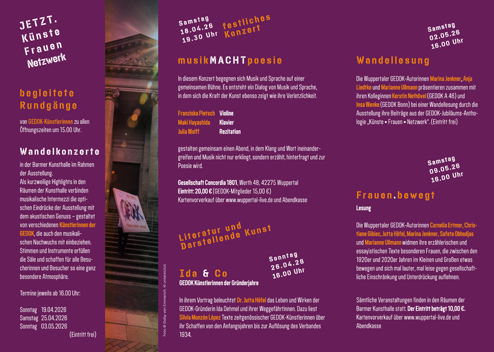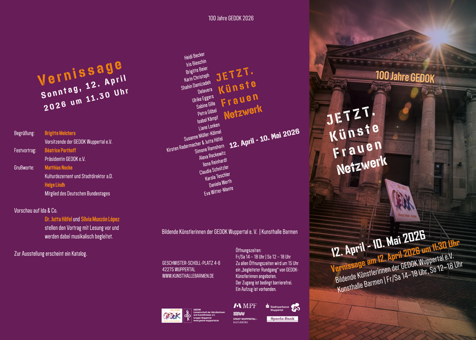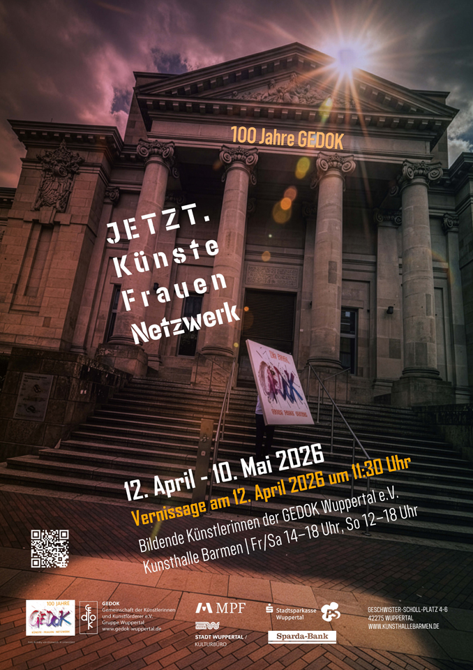 Anlässlich des 100-jährigen Bestehens präsentiert die GEDOK Wuppertal aktuelle künstlerische Positionen ihrer Mitglieder in den musealen Räumlichkeiten der Barmer Kunsthalle. Die jurierte und kuratierte Ausstellung zeigt das vielfältige und hochwertige Schaffen der Künstlerinnen einem breiten Publikum.