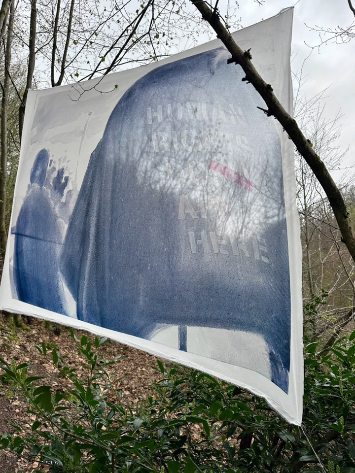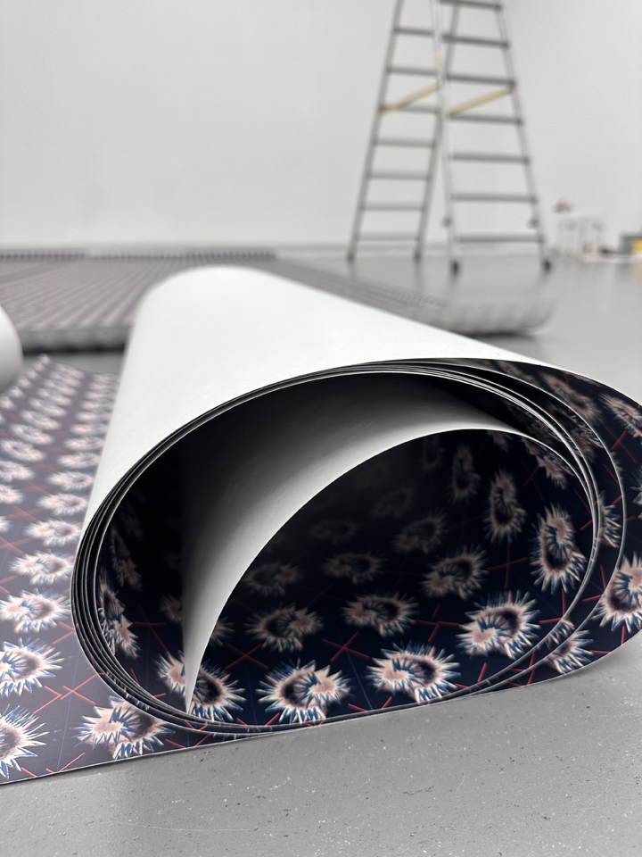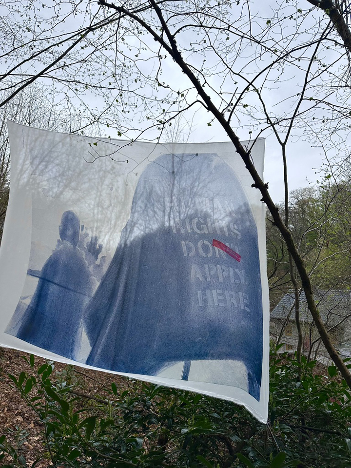 In der Installation spielt Stofflichkeit eine große Rolle. Dieses Upcycling mit Ecken und Kanten, Mustern und Strukturen, mit Transparenzen und Übergängen als Ausdruck einer fragilen aus den Fugen geratenen Welt, thematisiert einerseits Erinnerungsmomente und gleichermaßen das Happy End als Kontrapunkt und Strategie mit utopischem Ausblick.