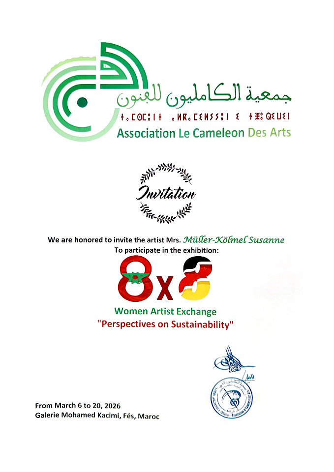 GERMAREX – Deutschland/Marokko Beitrags-Autor:Susanne Müller-Kölmel Beitrags-Kategorie:Ankündigung / Ausstellungen Im Rahmen eines interkulturellen Austausches zwischen Marokko und Deutschland präsentieren 16 Künstlerinnen ihre Arbeiten, jede fokussiert auf unterschiedliche Aspekte der 17 Nachhaltigkeitsziele (SDGs). Das könnte dir auch gefallen Schätze der Artothek 1. Dezember 2023 WDR Studiogespräch 10. September 2024 Burger Bienale 2024 9. September 2024